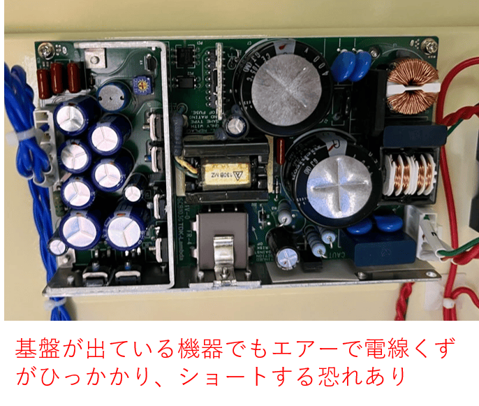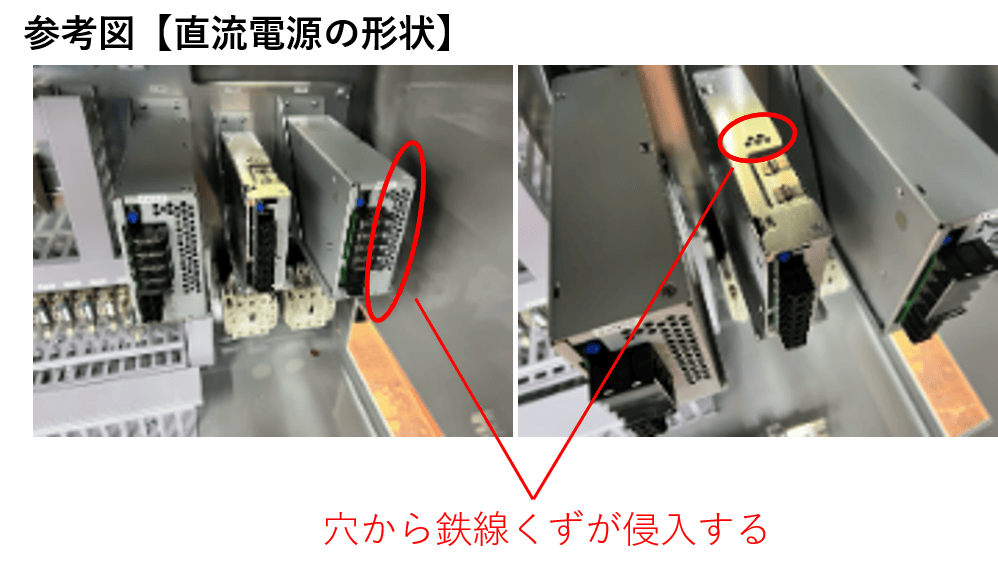 直流電源(パワーサプライ)やシーケンサなどの精密機器は、熱を発するため通気口を備えた構造となっており、指が入らない程度のカバーやファンで冷却されています。これらの機器は通気口からの異物侵入に対して脆弱で、電線くずなどの導電性物質が侵入すると基板内で短絡(ショート)を起こし、機器破損や最悪の場合は火災につながるリスクがあります。